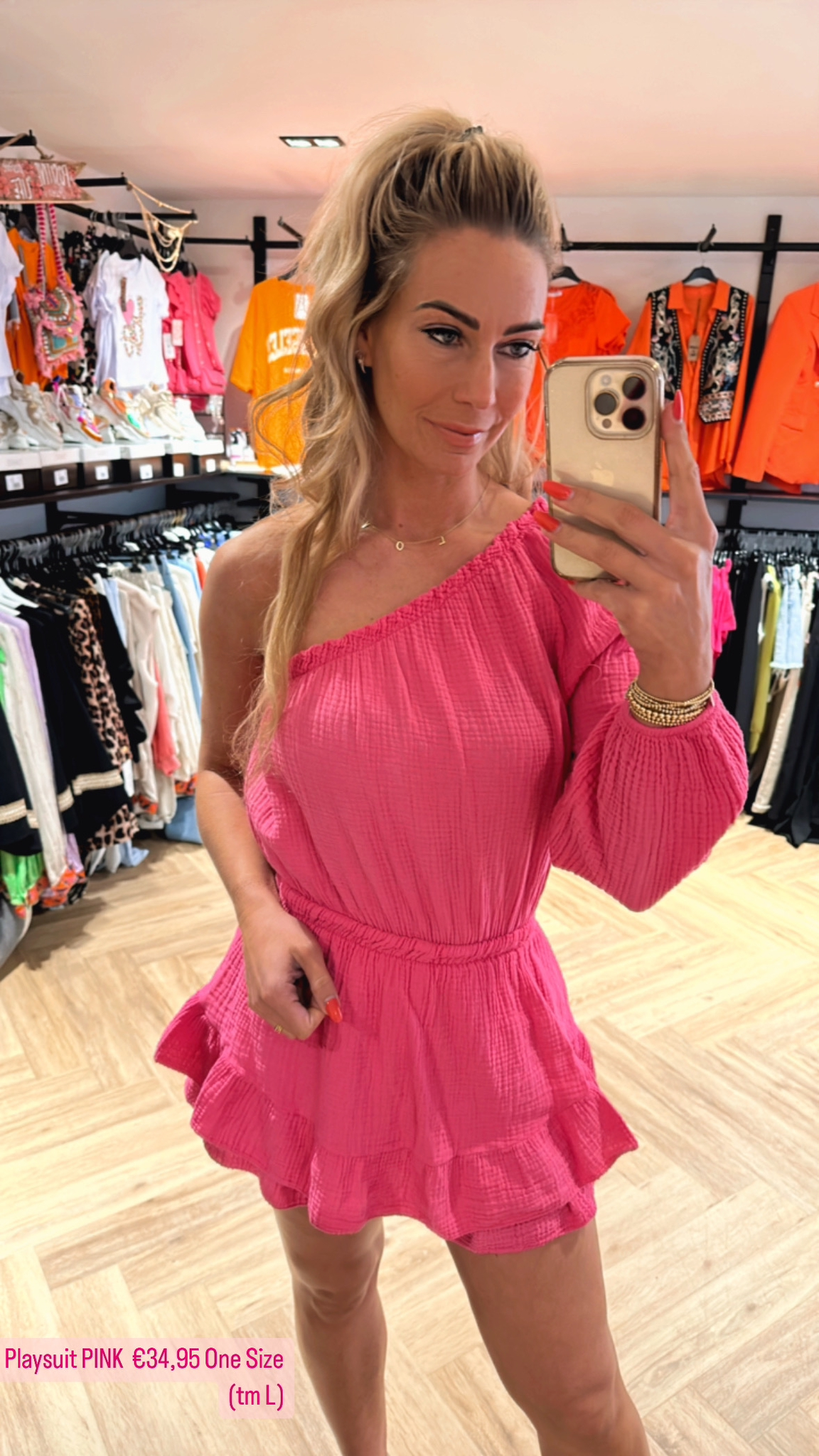 De bestseller van vorige zomer is terug!! De one sleeve playsuit pink is in one size verkrijgbaar & te dragen tot maat L.