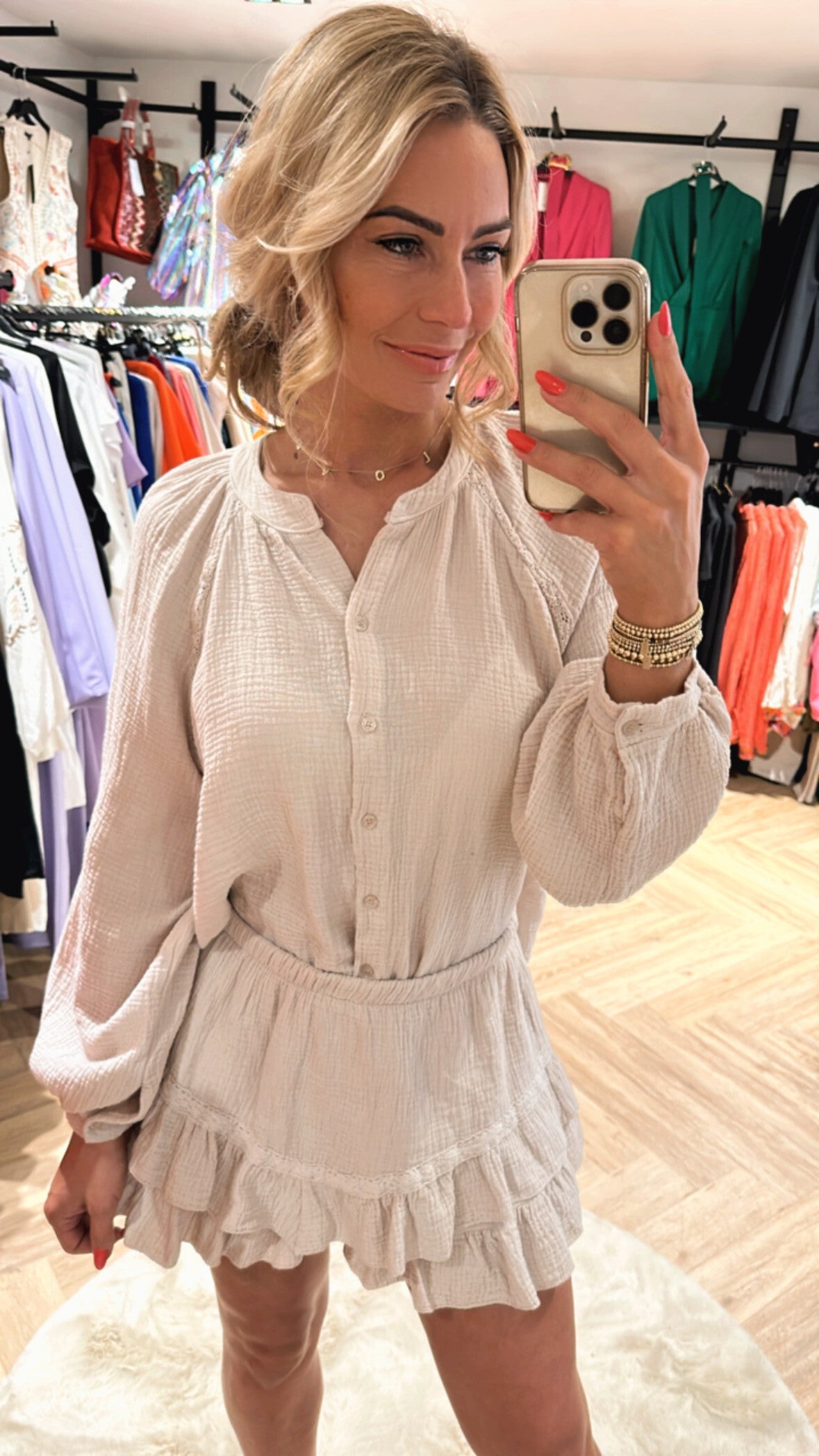 Dit heerlijke beige setje bestaat uit een blouse en broekrokje en is van 100% katoen is met een wafelstof (mousseline) en is One Size te dragen tm L.