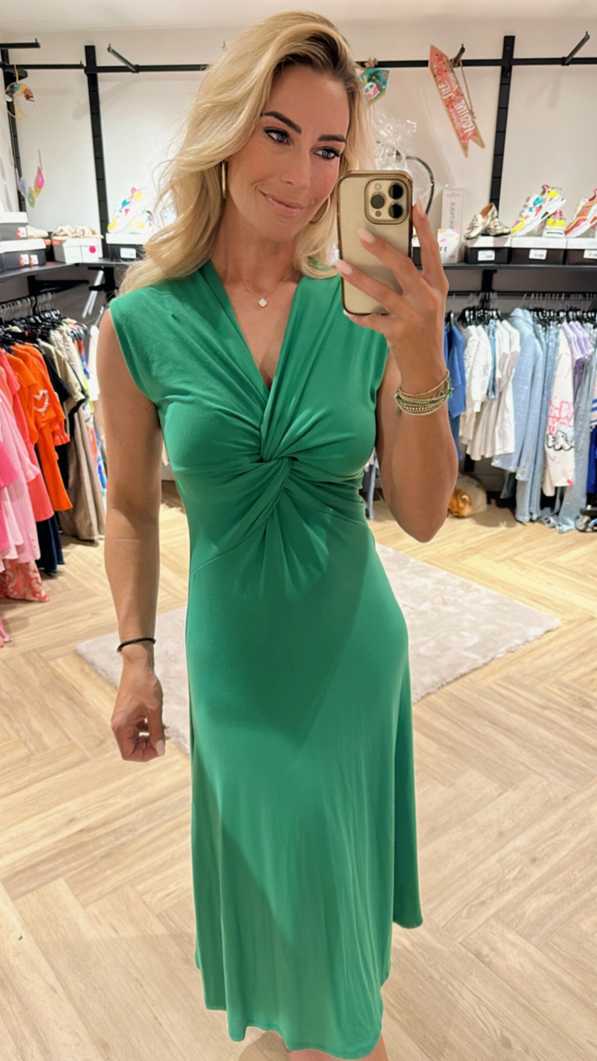 De jurk is mouwloos en in het zwart Camel en groen verkrijgbaar bij ons.