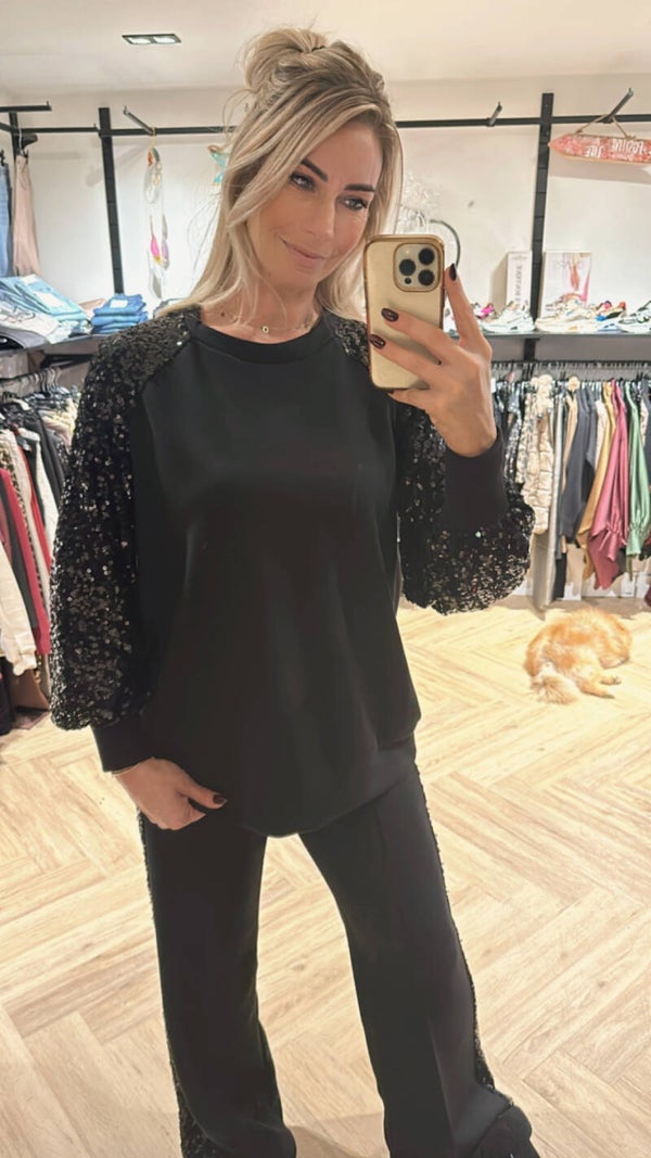 Dit te leuke zwarte pak is toch een uitkomst voor als je thuis blijft met de feestdagen toch comfy maar leuker dan je pyama!!
