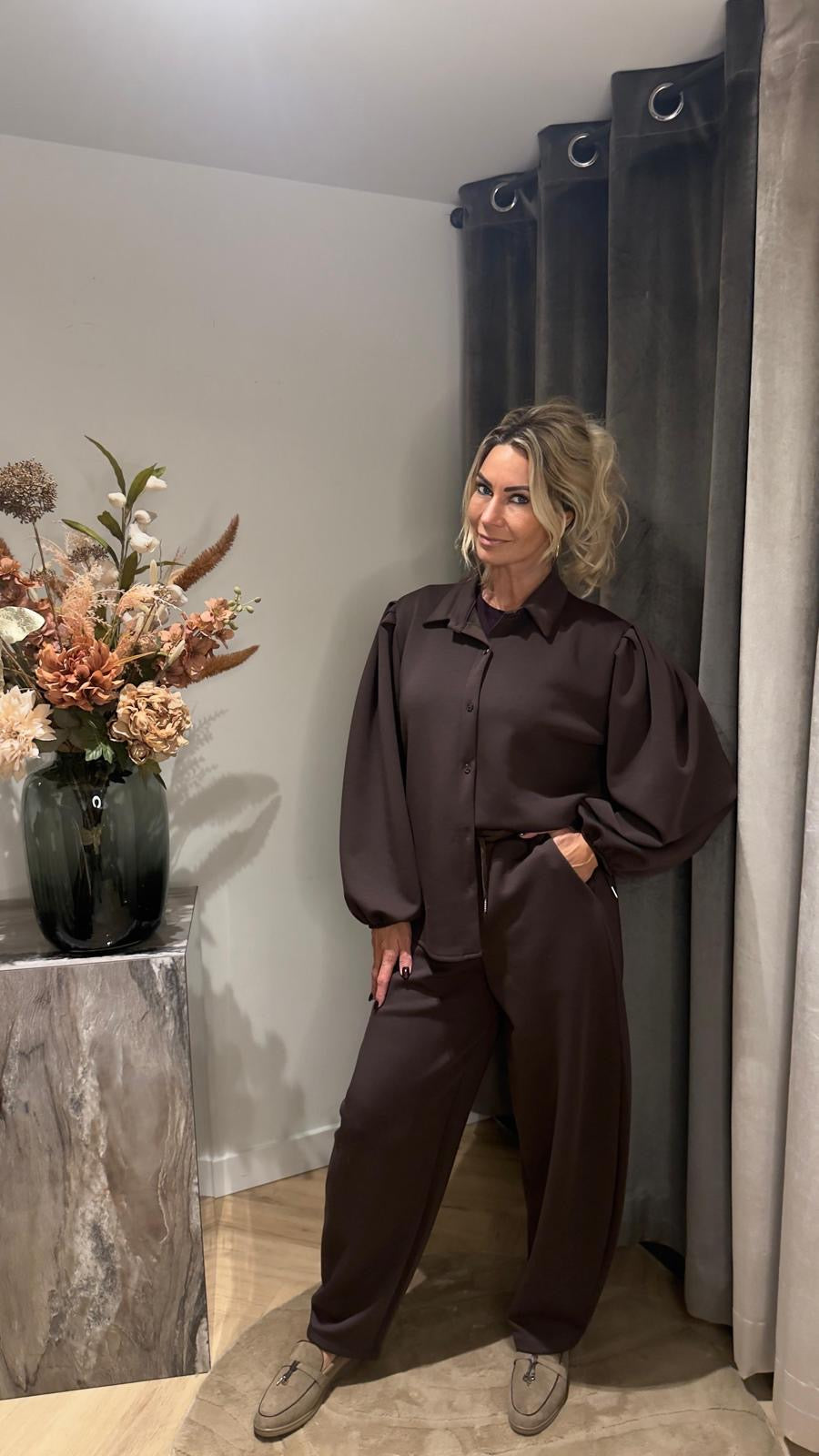 Maak je feestelijke look compleet met deze elegante Blouse Festive Bruin. De trendy pofmouwen geven deze blouse een speelse en vrouwelijke touch, perfect om te combineren met de bijpassende Festive broek voor een complete outfit.