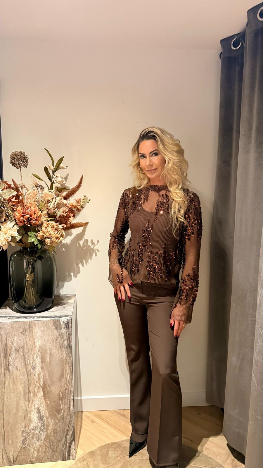 Stijlvolle bruine flair pantalon met elastische tailleband voor optimaal draagcomfort. Perfect voor zowel casual als chique gelegenheden.