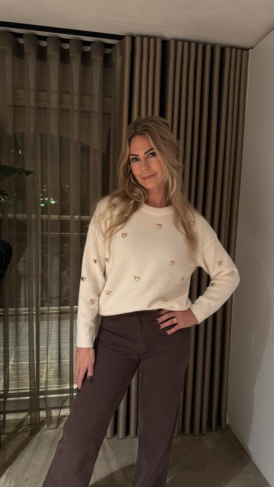 Trui Hearts Studs Creme – een luxe gebreide trui in creme met speelse heart studs voor een romantische en chique uitstraling.