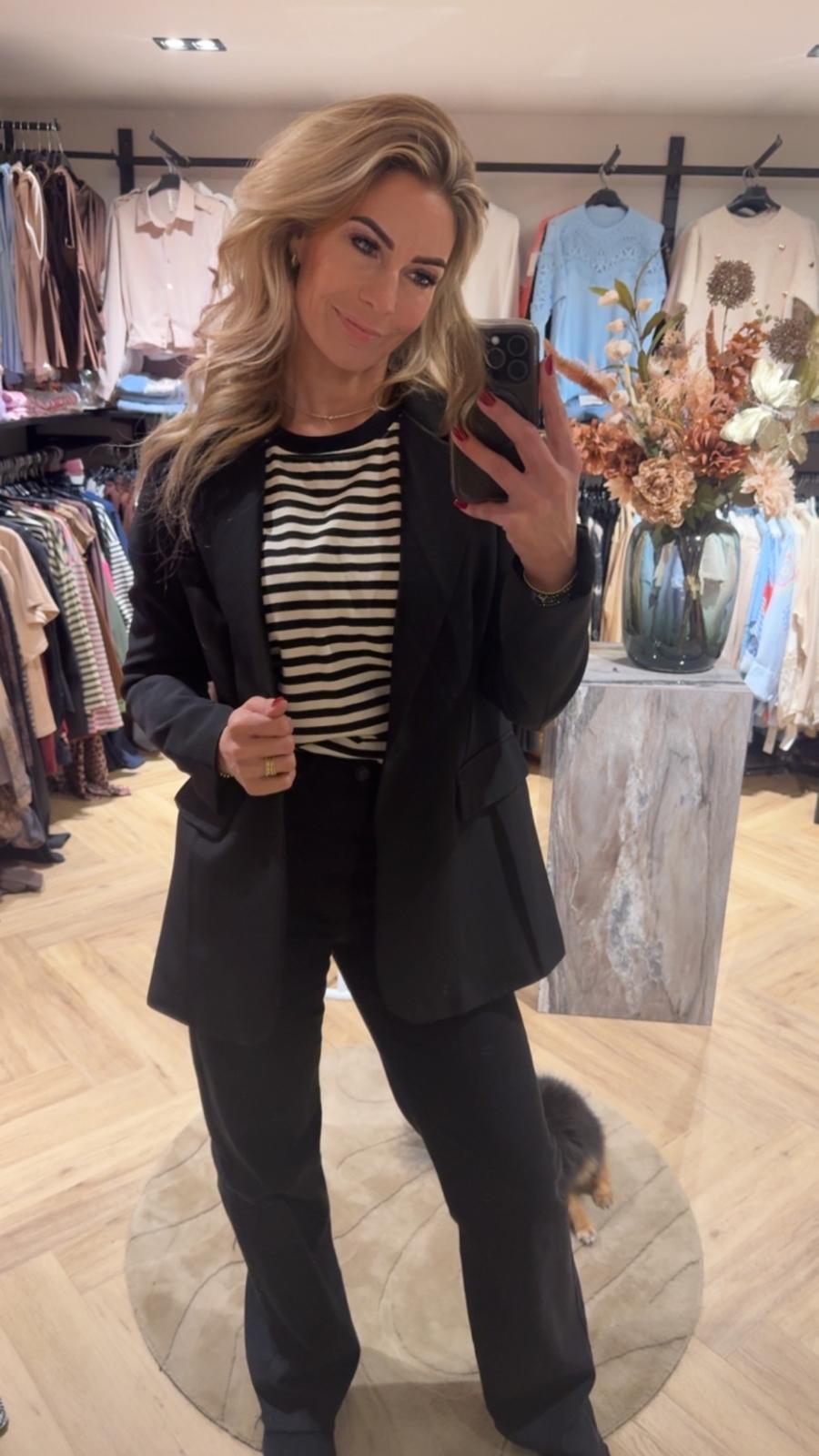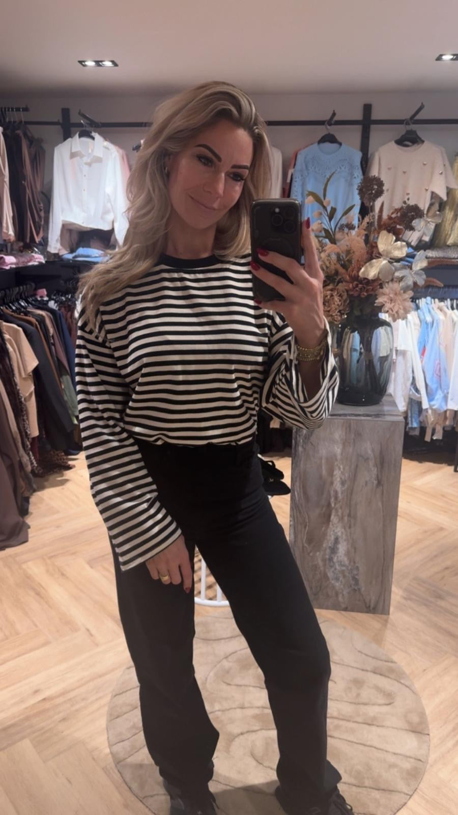 Stijlvolle longsleeve trui met zwart / witte strepen. Een comfortabel en veelzijdig kledingstuk dat perfect is voor een casual-chique look.
